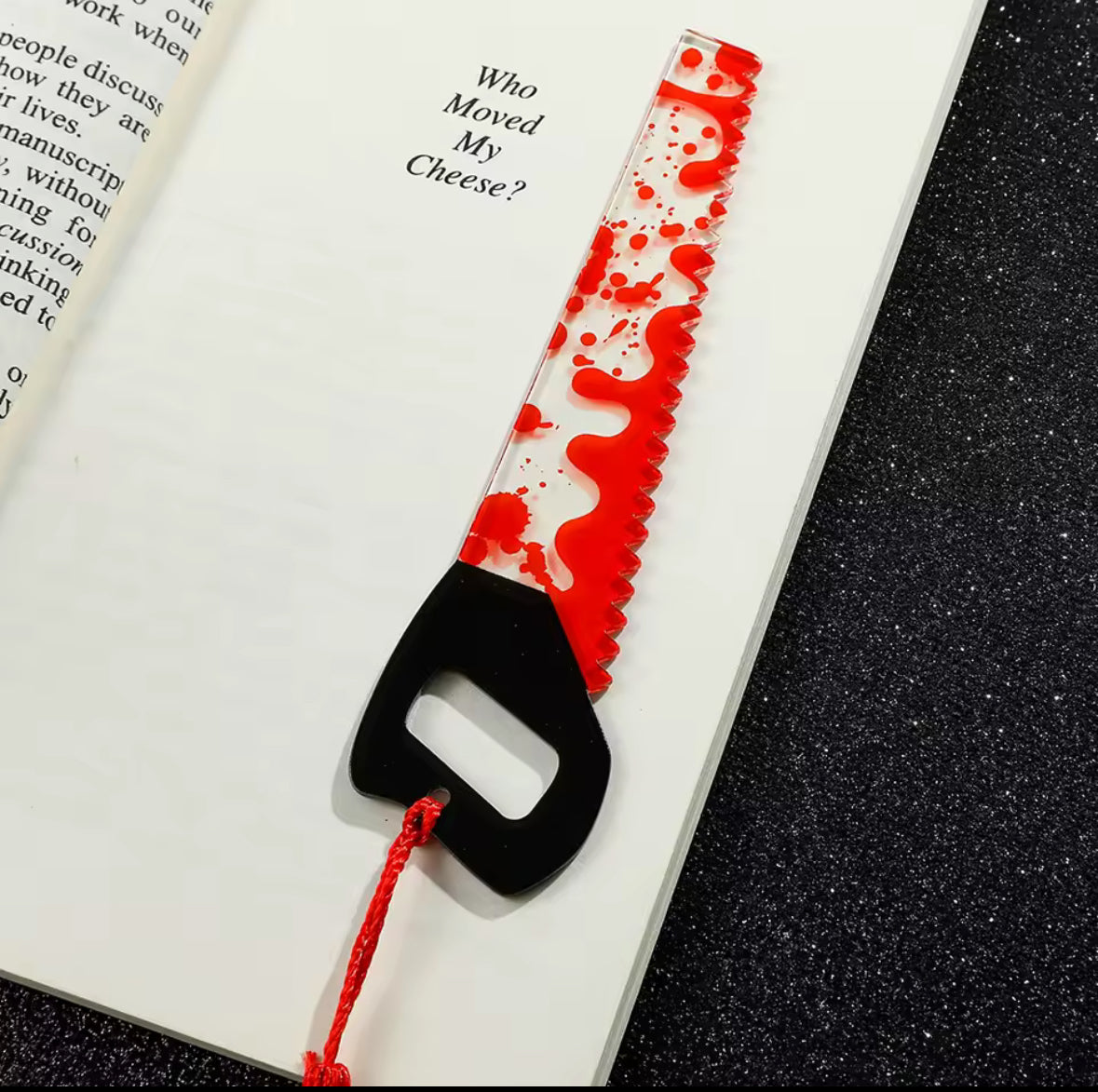 Make your reading spine-chilling with the Horror Knife Clear Acrylic Bookmark. Featuring a blood-splattered chopper saw design and a stylish tassel, this Halloween-themed accessory adds a daring touch to every page you mark. Ideal for bookworms who love a thrill, it’s a bold way to keep your place in any creepy tale.
