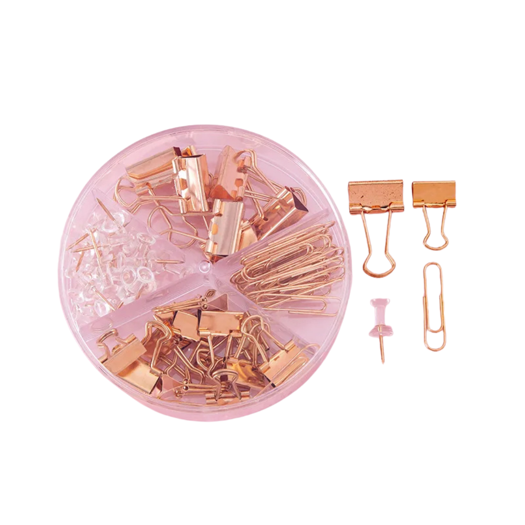 Say goodbye to the great office supply hunt! This all-in-one clip set brings together binder clips, paper clips, and thumb tacks—your desk's new best friends. Whether you're wrangling stacks of papers, organizing loose sheets, or pinning inspiration to your wall, this collection has you covered. No more rummaging through drawers or making emergency supply runs. Keep everything you need within arm's reach and tackle your projects with style and confidence.