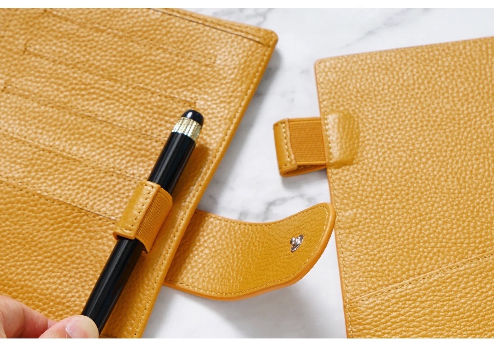 Right - slip pocket, 5 horizontal card slots, bottom pocket, outward elastic pen loop