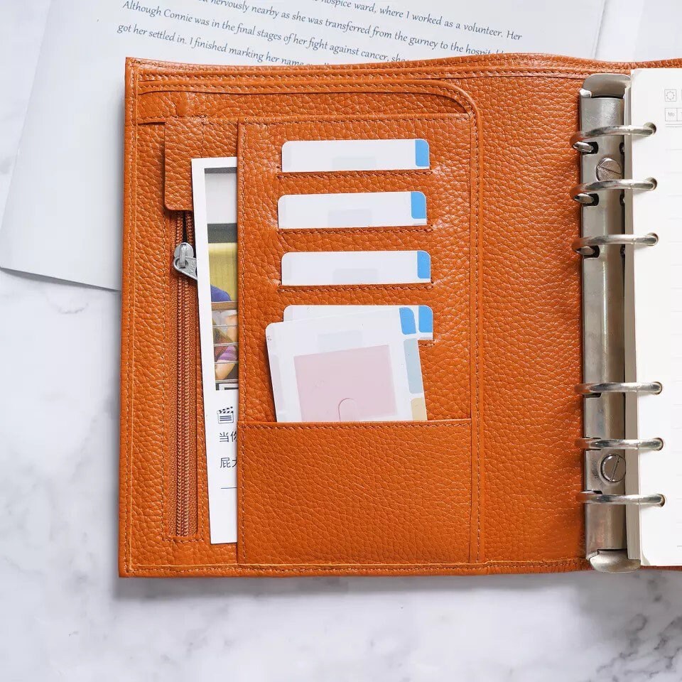Right - secretarial pocket, slip pocket, 4 horizontal card slots, bottom pocket,
