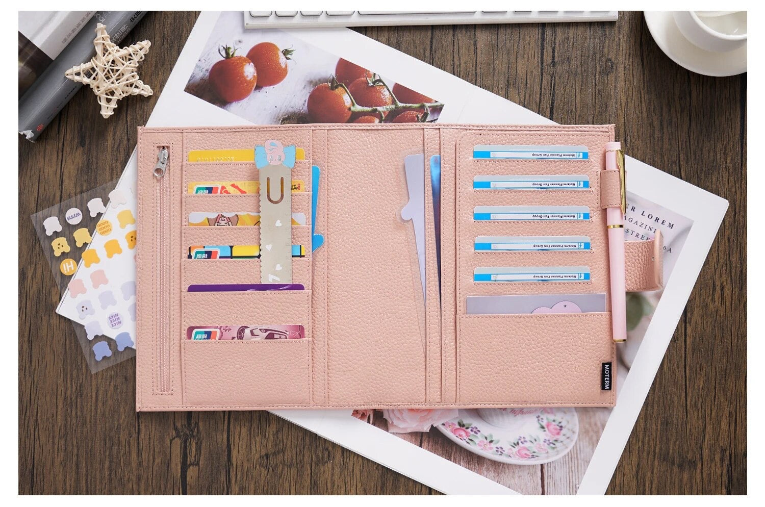 Interior layout: 5 card slots, individual card slots, 5 slip pockets, small secretarial pocket, fixed pen loop, large back pocket.